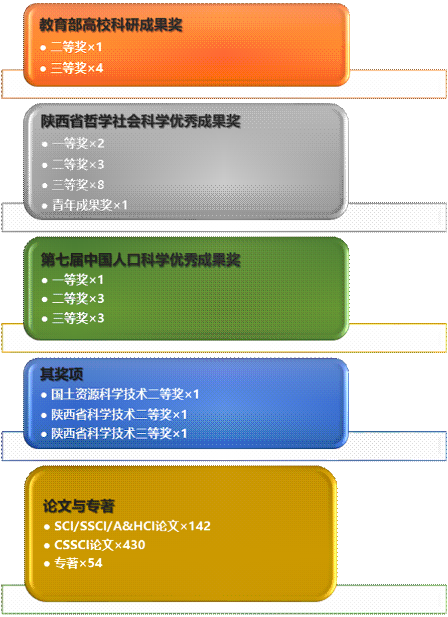截止目前,研究院共承担各类国家级基金项目90余项,其中国家社会科学基金重大项目7项、教育部哲学社会科学重大课题攻关项目2项、国家社会科学基金重点项目9项、国家自然科学基金项目42项,国家社会科学基金项目47项,开展高水平国际基金和国际合作项目29项。发表SCI、SSCI、A&HCI论文142篇,权威期刊论文和三报一刊理论文章4篇,出版高水平学术专著54部,国家和省部批示采纳的智库成果10余次。在多个研究领域的研究成果已得到中央和地方领导的重要批示和肯定,并对相关的公共政策产生了积极影响。