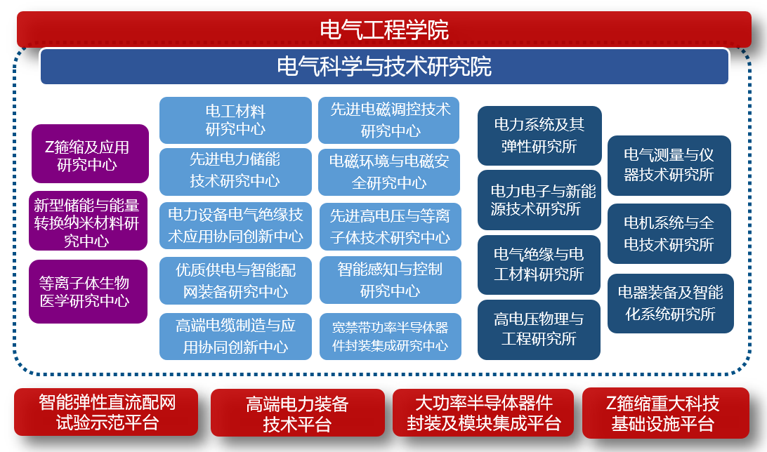 电气科学与技术研究院设立20个研究所(中心),汇聚世界一流高层次人才,建成世界一流研究平台,促进多学科多领域交叉融合,保持优势、突出特色、协同创新,探索科研成果转化新机制和人才培养新模式,打造具有显著引领性和示范性的全球科教高地,努力取得前沿技术和颠覆性技术的重大原创性突破,成为电气工程领域原创性科学理论与先进电气技术输出的源泉,以科技创新引领电气科学与技术的发展。