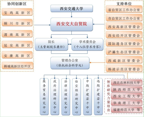 自贸院由主管副校长席光教授兼任院长,社会科学处为秘书处单位,下设4+X个研究中心。其中,服务贸易研究中心,侧重于构建体现中国特色的国际经济和服务贸易理论及战略框架,动态把握世界同中国服务贸易发展趋势和经济发展内在规律;政府治理与创新研究中心,致力于政府治理与创新的理论、实践研究,探索陕西自贸试验区在政府职能、运行机制、行政改革、政府治理等方面的改革创新;法律治理研究中心,从事自贸试验区政策法律及其治理机制的研究,针对陕西自贸试验区法治建设积极向相关单位提供决策建议,开展交流合作和业务培训。临空经济研究中心侧重于自贸试验区临空经济发展,针对“一带一路”格局、推动自贸区制度创新等开展学术活动及课题研究。